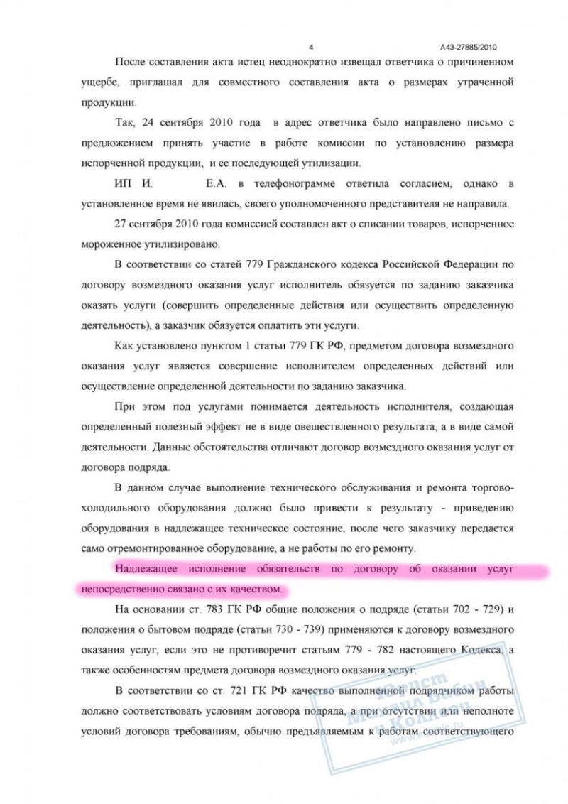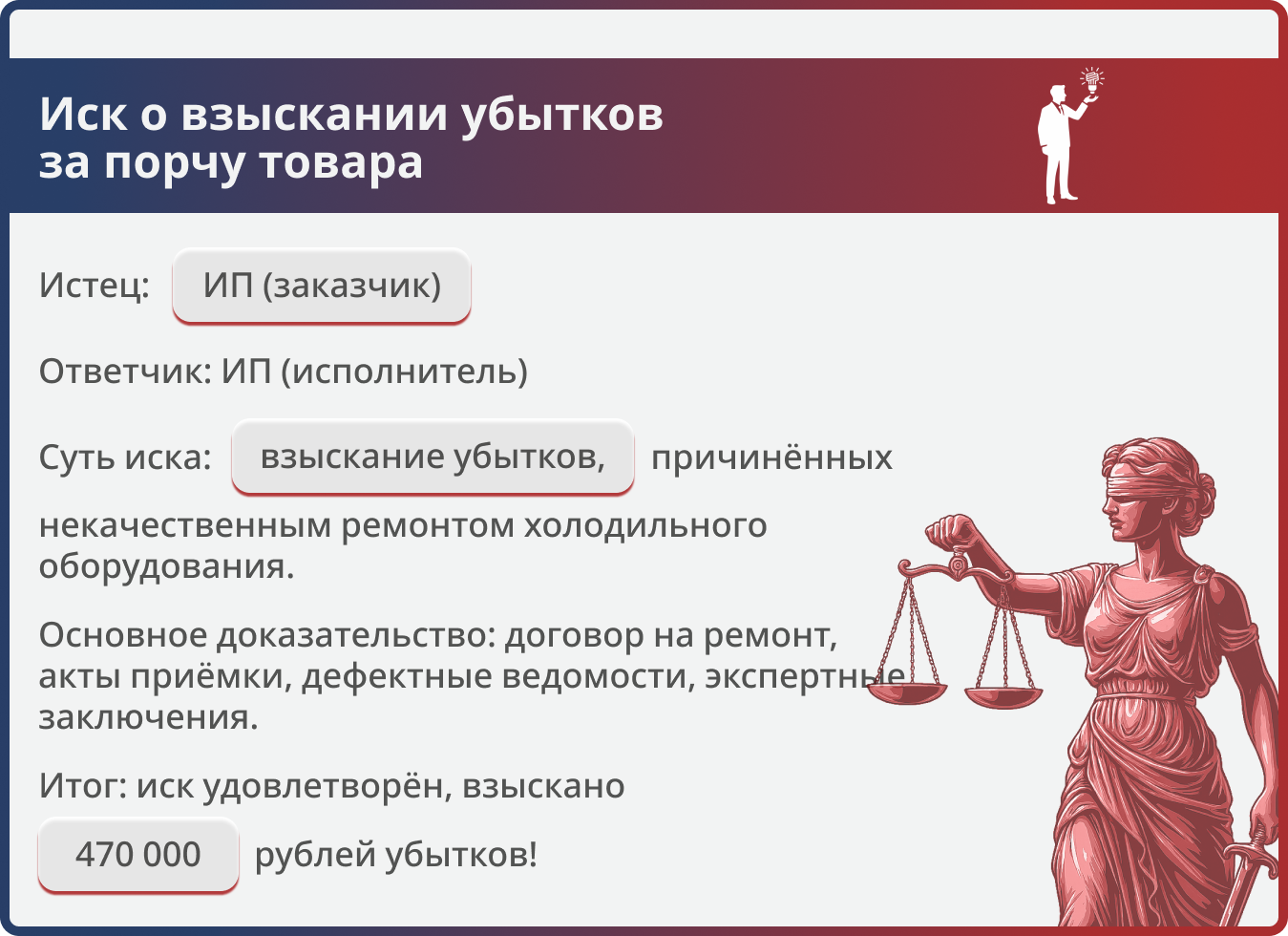 Некачественный ремонт холодильного оборудования привёл к порче товара на 470 000 руб. Исполнитель отказался возмещать ущерб. Юрист доказал причинно-следственную связь, и суд взыскал всю сумму убытков и судебные расходы.