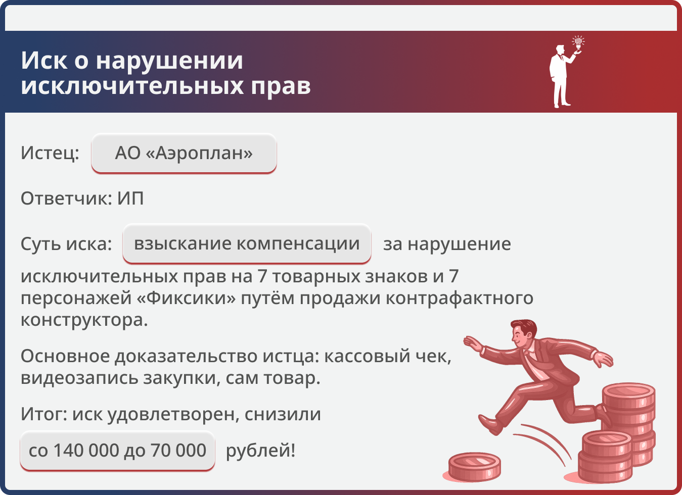 Снижение компенсации за нарушение прав на товарный знак компании АО «Аэроплан» (бренд «Фиксики») со 140 000 до 70 000 рублей за продажу контрафактного конструктора
