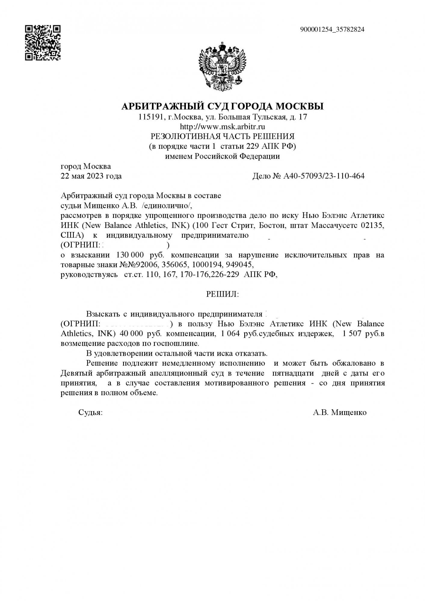 Истец (New Balance Athletics, INK) обратился в Арбитражный суд города Москвы с иском к ИП о взыскании 130 000 руб. компенсации за нарушение исключительных прав на 4 товарных знаки. Основанием послужила продажа контрафактного товара (предположительно обуви или одежды) в торговой точке ответчика. Дело рассмотрено в порядке упрощённого производства без вызова сторон.