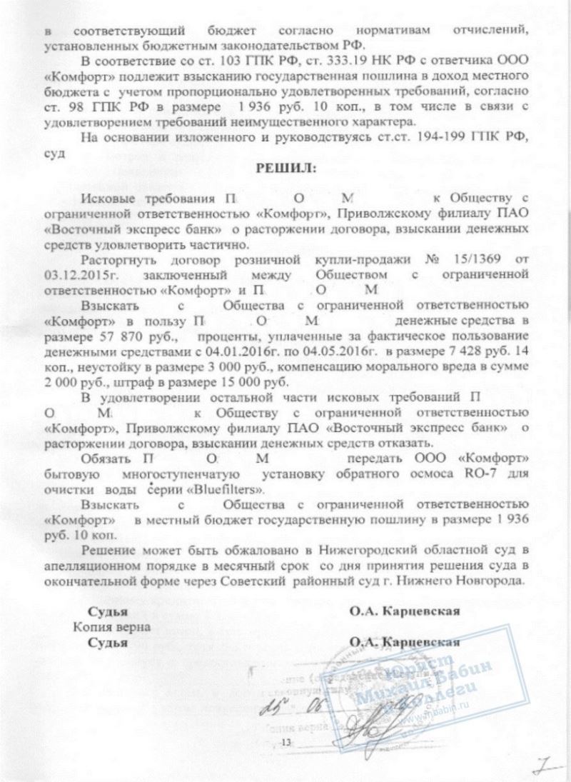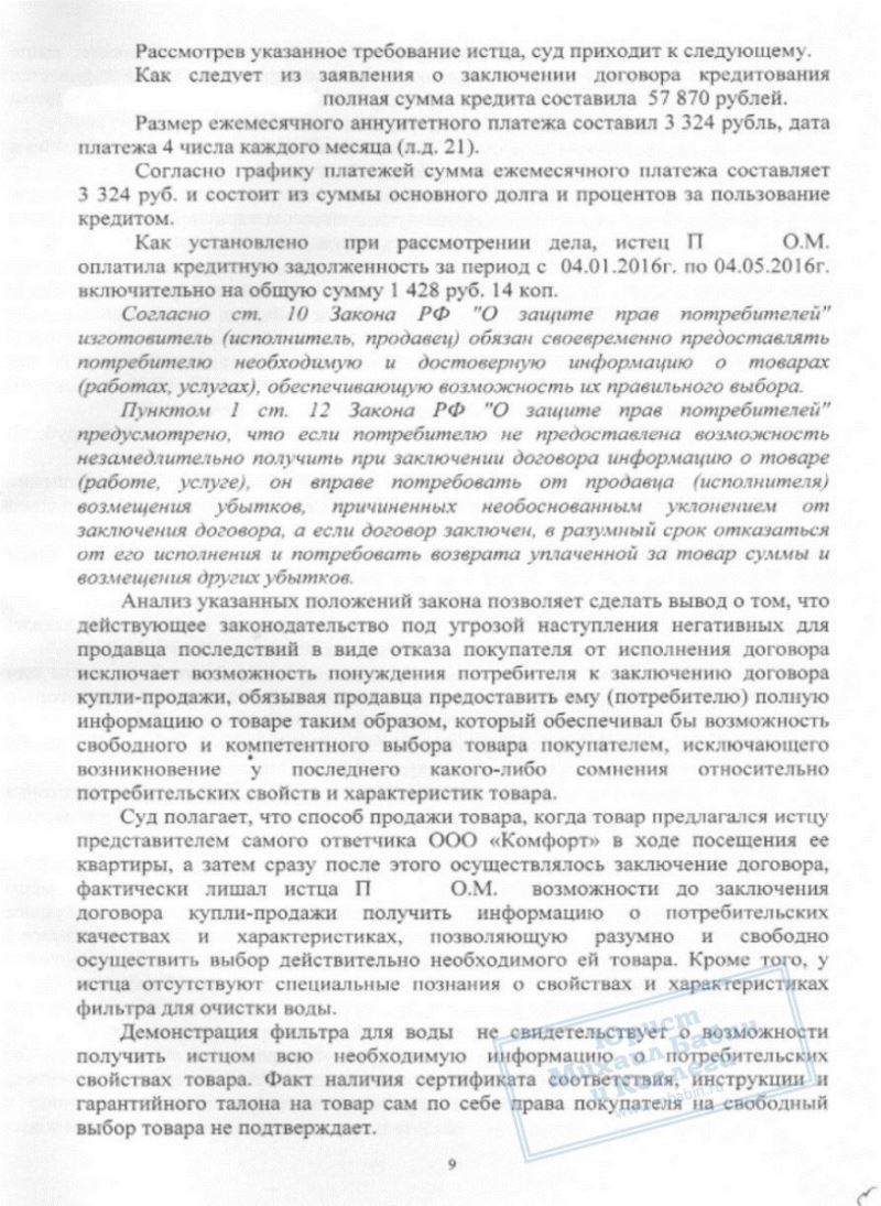 Вскоре стало ясно, что приобретение далеко не так совершенно, как это расписывал продавец. Оказалось, что "немецкое качество" - это не более, чем фигура речи, так как произведены фильтры в Польше. "Беспроцентный кредит" так же оказался фальшью - банковские проценты попросту уже были включены в стоимость товара. Техническая документация на прибор оказалась неполной, не существовало даже инструкции по использованию данных фильтров. И самое главное, П.О.М. осознала, что поторопилась с покупкой, но делать было нечего - на её имя уже был оформлен кредит.