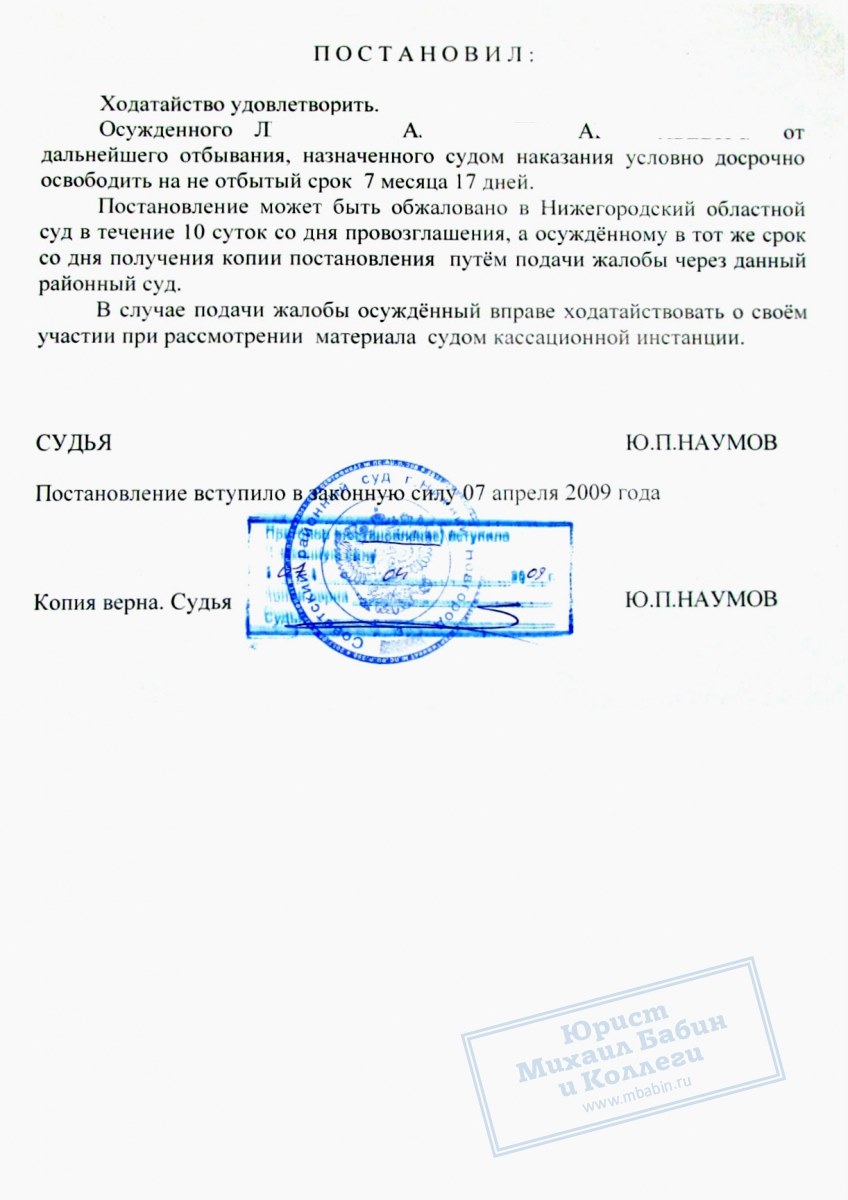 Юристы нашей компании собрали материалы, характеризующие Л. с положительной стороны, и на их основе составили грамотное ходатайство о досрочном освобождении. В результате суд постановил освободить Л. на 7 месяцев и 17 дней раньше фактического окончания срока его наказания.