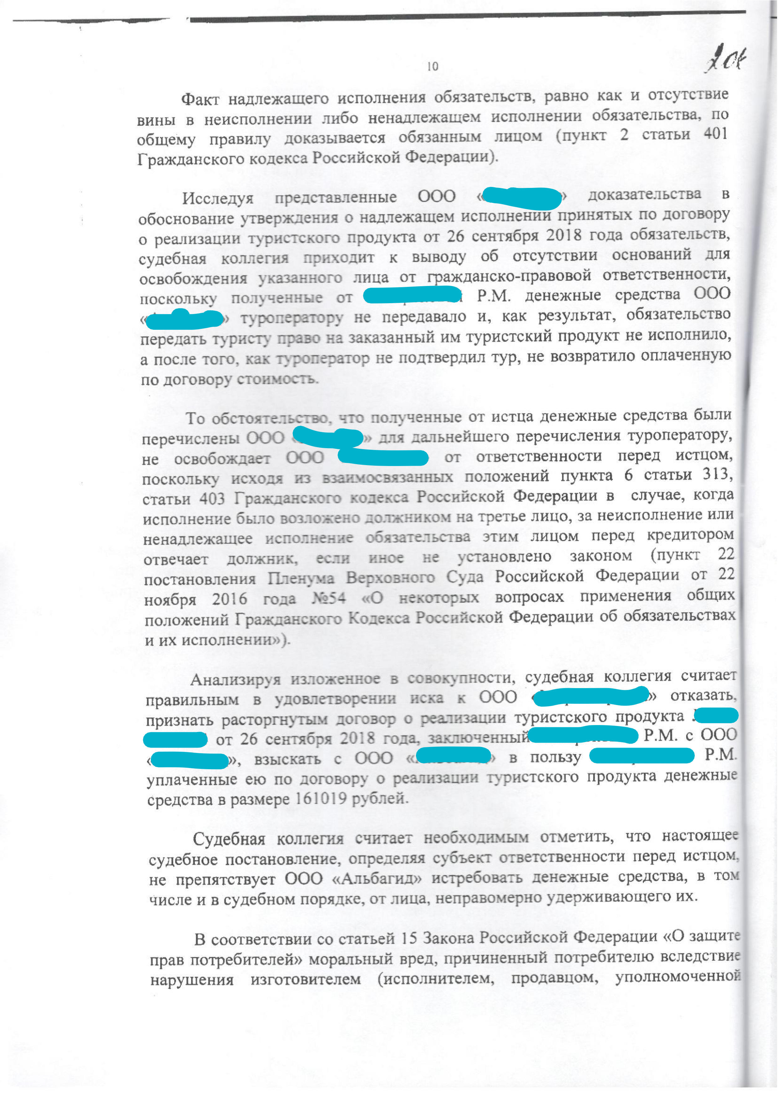 Взыскать с туроператора в пользу клиента деньги за турпутевку