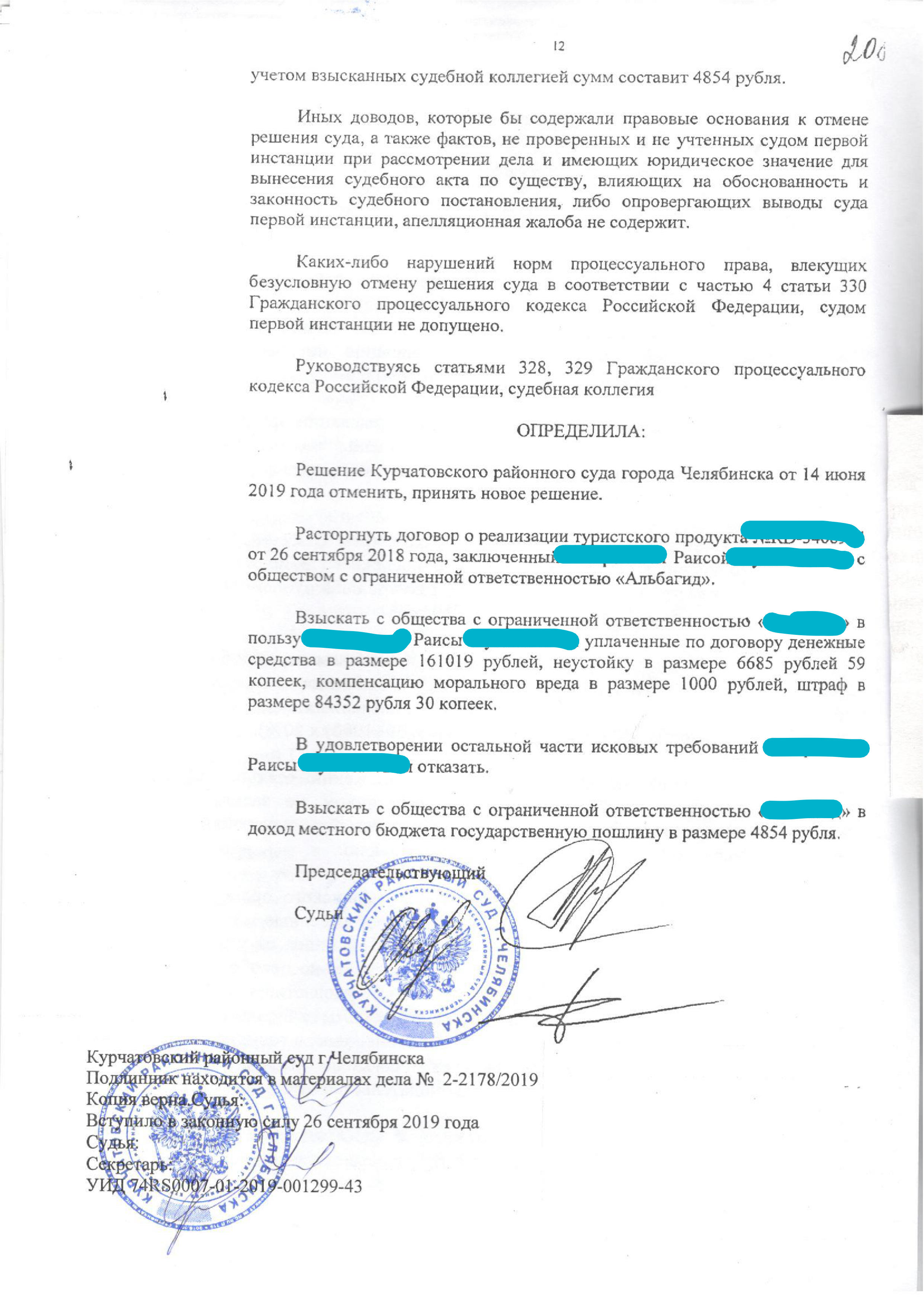 Раиса В. приобрела путевки у туроператора на семью в Эмираты, общей стоимостью 161 019 рублей. Но как оказалось позднее, исполнять обязанности по договору никто и не собирался, как собственно и возвращать деньги. Деньги не маленькие, да и в Арабские Эмираты все также хочется, планы нарушены, настроение испорчено. Раиса В. обратилась к нам за помощью.